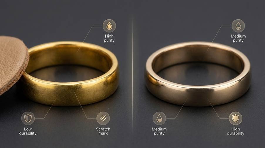 | Durabilité | Excellente (18k équilibré) | Bonne (14k-18k dur) | Faible (24k trop mou pour un port quotidien) |