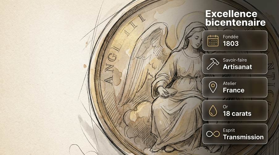 Fondée en 1803, Arthus Bertrand représente 221 ans d’artisanat joaillier français. Manufacture historique spécialisée médailles symboliques, décorations officielles (Légion d’Honneur), et bijoux patrimoniaux.